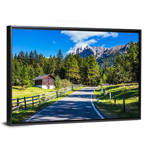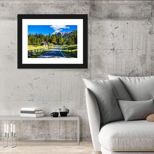Photorealistic nature photography showing a winding mountain road through forested mountains, with a wooden fence, white road markings and a cabin beneath rocky peaks. The green, blue, brown and white palette gives a peaceful, serene and quietly adventurous feel; suited to living rooms, hallways, or cabins.