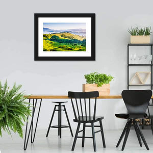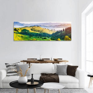 Rolling Countryside Farm, Ukraine shows rolling hills, scattered trees and distant mountains bathed in soft morning light. Sunlight filters through mist over lush green foliage in bright green, blue, yellow and white tones, creating a peaceful, naturalistic scene that fits modern or nature-inspired rooms.