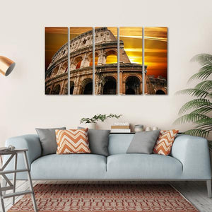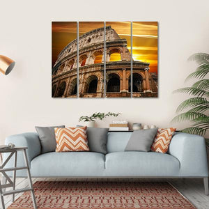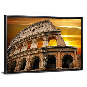 Capture the allure of the Colosseum at sunrise with this captivating canvas wall art. The dramatic low-angle perspective showcases the ancient architecture bathed in warm hues of orange and brown, highlighting the textured arches against a cloudy sky. Perfect for adding an epic touch to any room.
