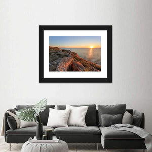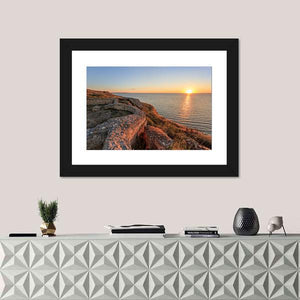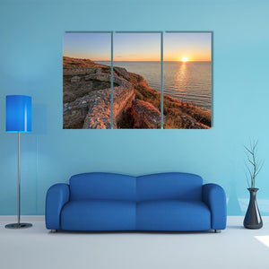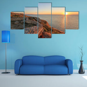 Roman Ruins Of Argamum shows ruins on coastal cliffs at sunset, with sun reflecting on the ocean and a stone wall on the cliff edge. The realistic landscape uses blue, orange and gold tones to create a serene, peaceful mood. It suits modern, nature-inspired home decor and room settings.