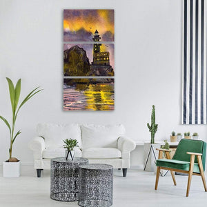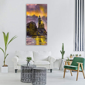 A centered lighthouse stands on a rocky outcrop beneath a stormy sky, its light reflecting across the water in purple, grey, yellow, brown, and white tones. Expressive watercolor brushstrokes, visible birds, and strong light beams create a dramatic, atmospheric scene that works well in modern or coastal-inspired rooms.