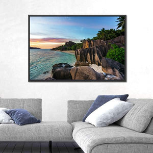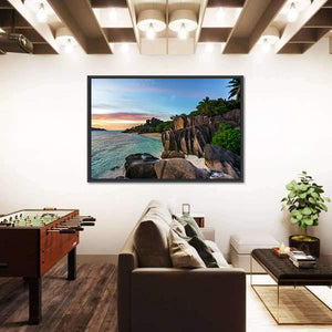 Romantic Sunset On Paradise Beach shows a beach scene with palm trees, granite boulders and calm water beneath a warm sunset sky, rendered in a realistic nature-photography style. Its serene, tropical mood and soft blues, greens and sunset oranges make it a natural fit for modern or coastal rooms.