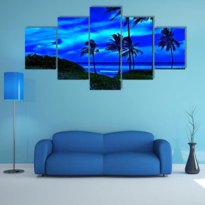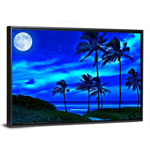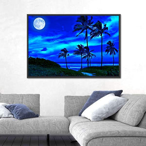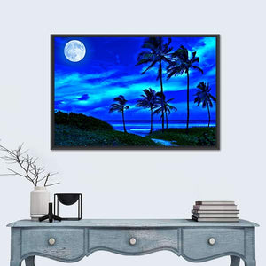 A romantic tropical beach at night with a bright full moon, silhouetted palm trees, and a calm ocean. The cool blue, white, green and black palette and rule-of-thirds composition create a tranquil, slightly magical mood. Works well in modern living rooms or bedrooms seeking peaceful, nature-focused wall decor.