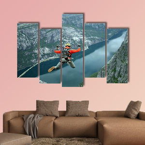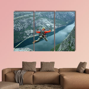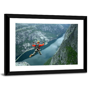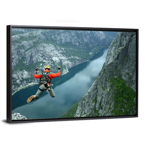 A photorealistic scene of a person base jumping from a cliff sets an adventurous, dramatic mood. Strong depth, perspective and rule-of-thirds composition emphasize scale and motion across a blue-green, grey and white palette, suited to modern or nature-inspired rooms.