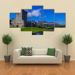Ross Castle On A Beautiful Day features a stone castle beside a calm lake, with a grassy lawn and distant mountains under fluffy clouds. Rendered realistically in blues, greens, grays and browns and composed using the rule of thirds, the scene feels serene, picturesque and quietly historic. It suits room decor and wall art collections that favor natural landscapes.