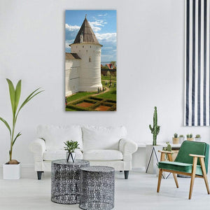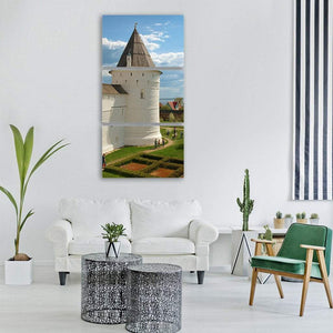 A realistic landscape of a white tower in Rostov, Russia, with a path leading to it and people walking under a sunny sky. Wooden roof shingles, small tower windows, and geometric garden beds give the scene a peaceful, historical feel suitable as room decor or wall art.