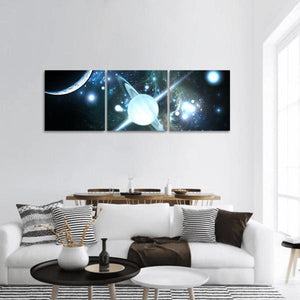 An abstract, sci-fi canvas that places a ringed planet, crescent moon, glowing orbs and swirling nebulae against a blue, black, white and green backdrop. The piece reads as cosmic, vibrant and dynamic, evoking an awe-inspiring outer-space mood. Suited to modern rooms and space-themed interiors.