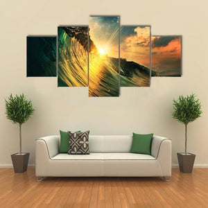 A close-up ocean wave at sunset captures sunlight bursting through the crest against dramatic clouds. The realistic, dramatic scene uses green, gold and orange tones and a rule-of-thirds composition to give strong depth and a serene, awe-inspiring mood. Designed as a canvas print that suits modern room decor in a house.