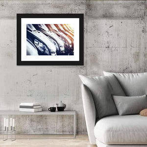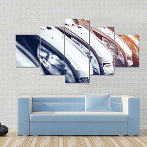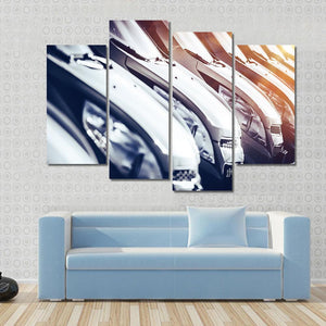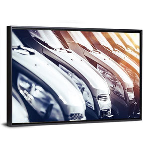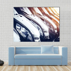 This canvas wall art captures a dynamic scene of rows of brand new cars, featuring a modern and sleek aesthetic. The close-up perspective and sunlight flares enhance its vibrant colors of silver, black, blue, and yellow, making it an eye-catching piece.