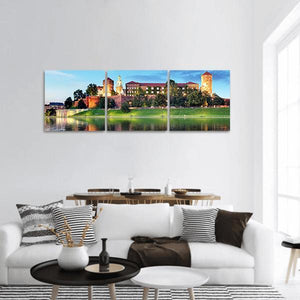 Royal Castle Wawel at Night captures the castle, river, and trees in a wide panoramic view with illuminated buildings and reflections on the water, creating a serene, historic, picturesque mood. The realistic color palette of blues, greens and warm highlights suits modern room decor and provides a quiet focal point for living rooms or studies.