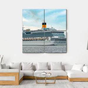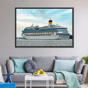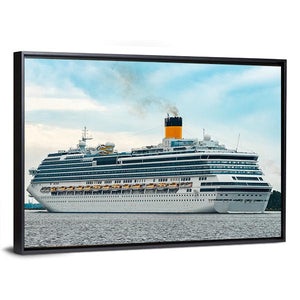 This canvas art depicts a serene cruise ship gliding over calm waters under a vast blue sky. The realistic portrayal with a striking yellow funnel and gentle smoke evokes a sense of grand travel and peaceful exploration.