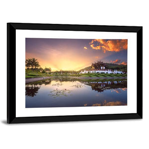 This landscape canvas features a serene sunset over a tranquil lake, adorned with traditional Thai architecture and vibrant lotus flowers. The rich palette of gold, purple, green, and blue enhances the peaceful vibe, making it a captivating addition to your home.