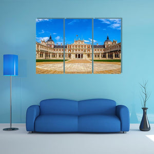 This canvas art features the grand Royal Palace of Aranjuez, showcasing its ornate facade and domed towers against a vibrant blue sky scattered with clouds. Perfect for adding a touch of historical elegance to any room.