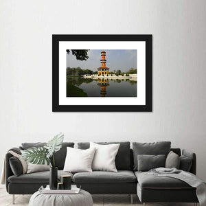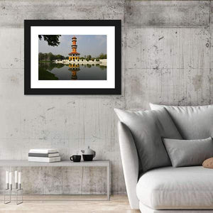 This serene canvas art features the iconic tiered tower of the Royal Summer Palace in Thailand, perfectly mirrored in calm water. Its harmonious palette of yellow, orange, blue, and green creates a tranquil ambiance, making it a wonderful addition to any space seeking a touch of nature.