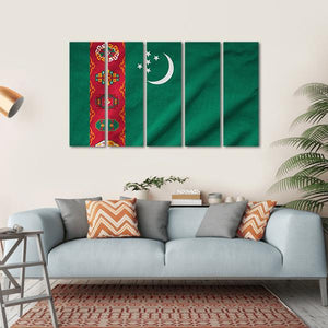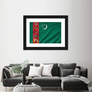 This striking canvas art features the vibrant Turkmenistan flag, showcasing a green field adorned with a vertical red stripe, enriched by intricate tribal patterns and symbolic elements like the crescent moon and five white stars. Its nationalistic and proud mood makes it a meaningful addition to any space.
