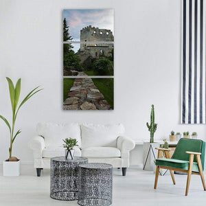 This canvas depicts the Ruin of Hohenwang Langenwang Castle at the end of a cobblestone path, with trees and grass lining the way. Rendered in muted grays, greens and browns, the scene feels historic, serene, and quietly intriguing—suitable for rustic or vintage interiors.