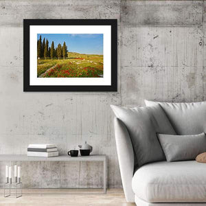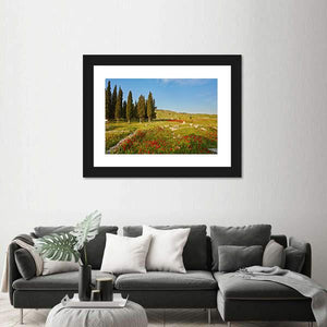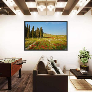 A naturalistic landscape showing ancient ruins in Turkey amid a field of red poppies, cypress trees, rolling green hills and a low stone wall. Sunlight and a clear blue sky cast soft shadows across the scene, creating a peaceful, vibrant, and serene atmosphere that fits modern home decor.
