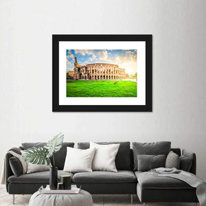 Ruins Of Antique Colosseum Canvas shows the Colosseum’s partially ruined arches above a green grassy foreground and a bright blue sky. The realistic, eye-level wide shot gives a historic, grand and serene mood. It works well with home room decor and modern interiors.