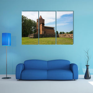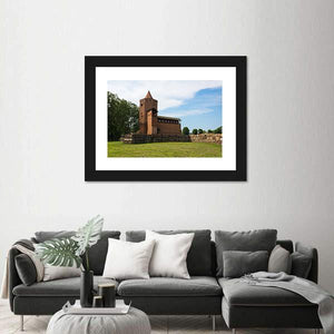 A realistic landscape of Gothic castle ruins, framed by trees and a weathered stone wall. Daytime summer light, a red-tiled roof and a wooden walkway give the scene a historic, scenic, and peaceful mood. The print’s realistic style works well as modern wall decor, adding calm architectural interest to living spaces.