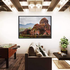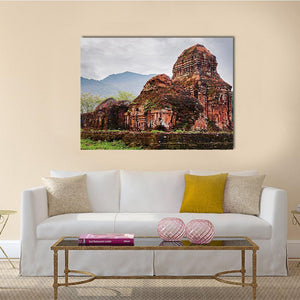 Explore the serene beauty of ancient Hindu temples set against a backdrop of rugged mountains and lush foliage. The weathered brick ruins, highlighted in rich reds and browns, evoke a sense of history and tranquility, making it a striking addition to any space.