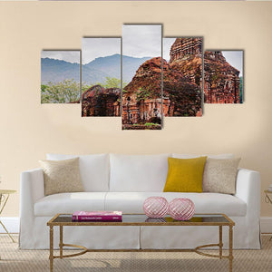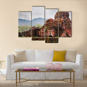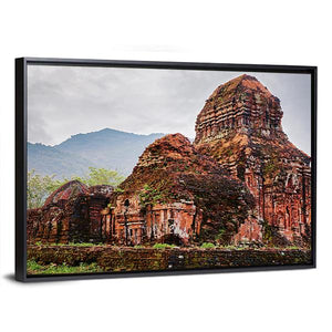 Ancient Hindu temple ruins rise from weathered brick towers, lush greenery, and distant mountains, rendered realistically in rich reds, browns, greens, greys and blues. The scene feels ancient, mysterious and serene. This canvas suits room decor in the home and pairs well with modern or rustic interiors.