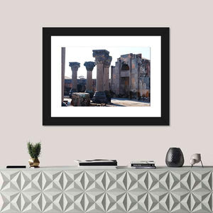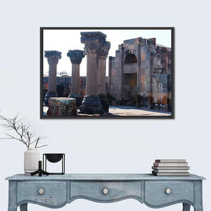 An eye-level view of the ancient Zvartnos Temple ruins, showing carved stone columns and a weathered arched entrance. Brown, gray, white and orange tones convey a historic, still mood with a rustic feel. Suits house interiors and room decor that lean rustic or modern.