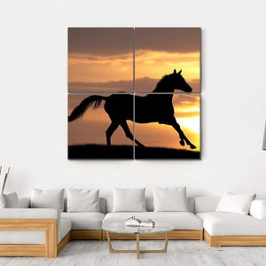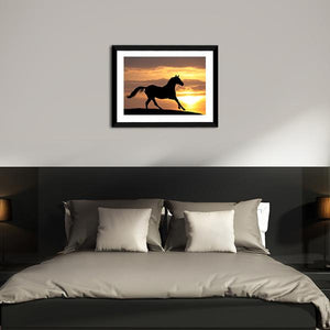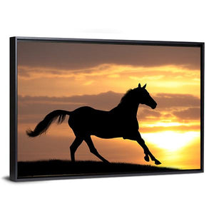 This canvas art features a striking silhouette of a horse in mid-stride against a dramatic sunset backdrop. The dynamic blend of black, orange, and yellow evokes a sense of majesty and peace, perfect for sparking conversation in any room.
