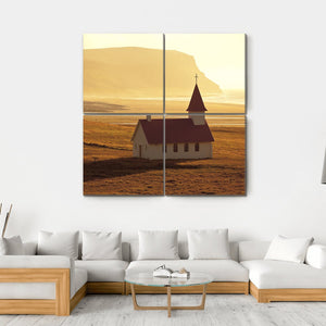 This canvas art features a serene rural Icelandic scene with a small white church framed by distant mountains and a grassy field. The warm hues of golden yellow and brown, along with the setting sun, evoke a peaceful and isolated atmosphere.