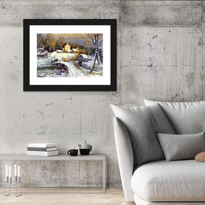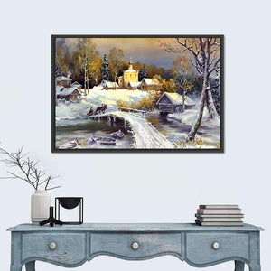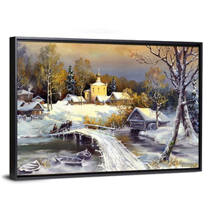 Winter Village with Church and Horse-drawn Carriage Canvas Wall Art