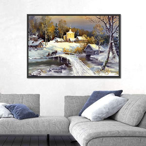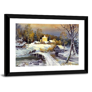 A peaceful winter village scene with a domed church, wooden houses, a snow-covered bridge and a horse-drawn sleigh by a river with boats in frozen water. Rendered in blues, whites, browns, yellows and greens, this rustic, vintage-style landscape brings quiet, wintry calm to cottage or farmhouse decor.