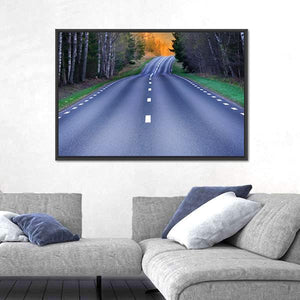 This serene canvas art features a tranquil asphalt road winding through a forest, highlighted by the warm glow of a setting sun. The photo-realistic style captures the inviting atmosphere of autumn in Scandinavia.