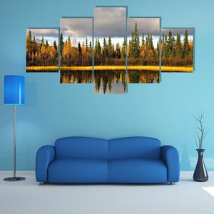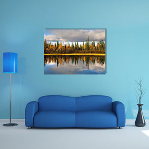This canvas art beautifully captures a serene landscape featuring evergreen trees, a tranquil lake, and a reflective sky filled with clouds. With its calming color palette of greens, yellows, and blues, it brings a touch of nature indoors.