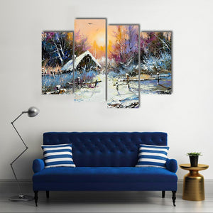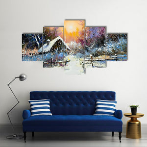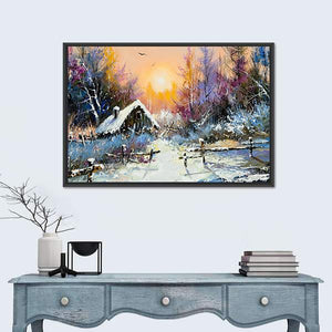 Snowy cabin and winter forest meet under a sunset sky in this rural winter landscape, creating a peaceful, serene, and cold mood. Thick impasto texture and layered strokes add depth—from wooden fence posts in the foreground to the distant glow—rendered in orange, blue, white, purple and yellow tones, and it suits modern or nature-inspired room decor.