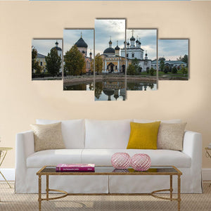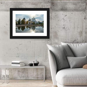 A Russian Orthodox church reflects across calm water, its onion domes mirrored among trees with swans nearby. Soft blues, greens, gray and touches of yellow create a serene, picturesque scene that works well as subtle wall art for modern home décor.