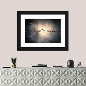 This canvas art depicts broken iron chains, symbolizing strength and freedom. The dramatic palette of brown, gold, and grey emphasizes the powerful imagery of chains breaking apart, with a glowing light emanating from the break, making it a captivating focal point for any wall.