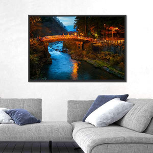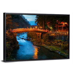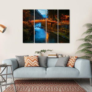 This captivating canvas captures a serene night scene of a bridge illuminated against a tranquil river. The palette of blues, oranges, greens, and browns reflects a peaceful autumn atmosphere, making it an ideal choice for your modern space.