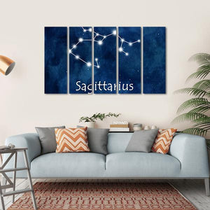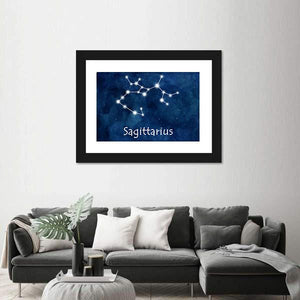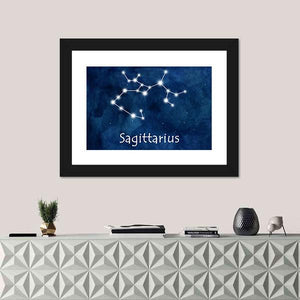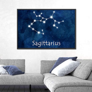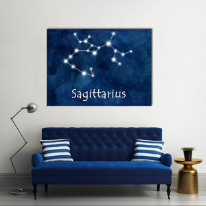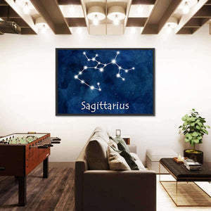 Explore the mystical Sagittarius constellation with this dreamy canvas art. The celestial pattern features bright stars connected by white lines on a deep blue background, making it an enchanting piece for any room.