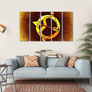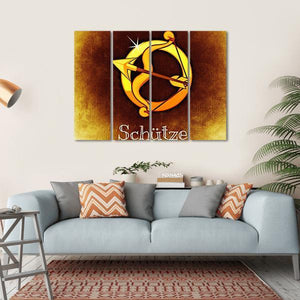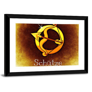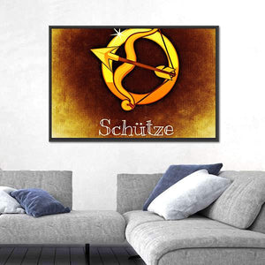 This canvas art features the Sagittarius astrology symbol, a golden bow and arrow, along with the word 'Schütze' below. Its bold and bright palette of gold, orange, brown, and yellow brings a symbolic touch to your space.