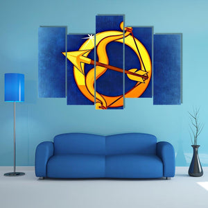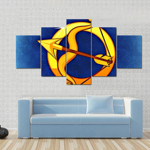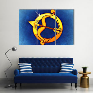 Sagittarius Zodiac Sign Canvas centers a bold, stylized bow-and-arrow symbol set against a blue, gold and orange palette, with white "Sagittarius" text below. The graphic, symbolic typography gives the piece a strong astrological mood and works well in modern or astrology-focused rooms.