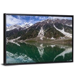 This canvas art captures the serene beauty of Saiful Malook Lake in Pakistan, featuring snow-capped mountains reflecting in the calm waters. The tranquil palette of greens, blues, and whites evokes a majestic and peaceful atmosphere, perfect for nature lovers.