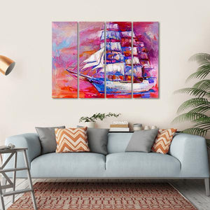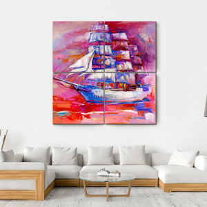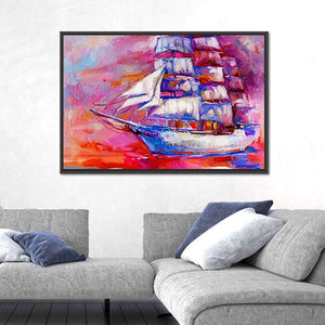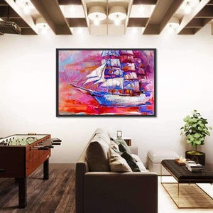 This vibrant canvas artwork captures the dynamic movement of a ship sailing across the ocean under a colorful sky. The thick brushstrokes and vivid colors evoke a sense of energy and drama, making it a striking addition to your wall decor.