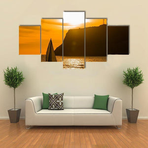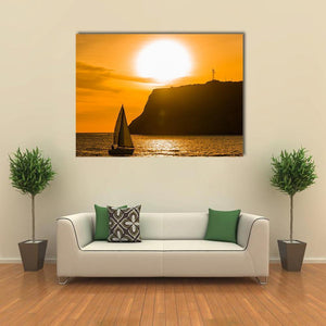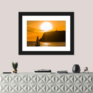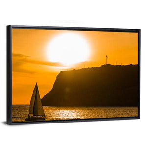 A single sailboat crosses calm water beneath a large orange sun, with the silhouette of a cliff and lighthouse on the horizon. The scene uses the rule of thirds for a balanced, serene yet dramatic mood. Suited to modern or coastal-inspired rooms as a warm focal piece.