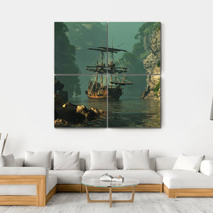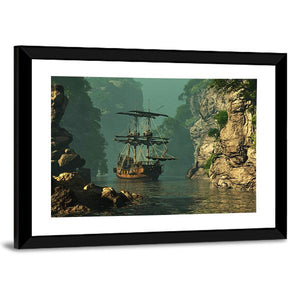 This striking canvas features a tall ship sailing among rocky cliffs, creating a serene yet adventurous atmosphere. Its realistic depiction combines deep greens, browns, and blues against a misty background, offering a glimpse into a mysterious waterway. Perfect for enhancing any room's decor with its dramatic charm.