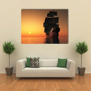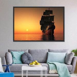 Bring the serene beauty of a tall ship sailing at sunset into your home. This realistic canvas art captures the majestic ocean scene, featuring full sails and vibrant reflections in shades of orange and yellow, creating a nostalgic atmosphere.