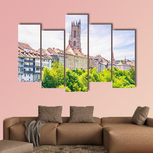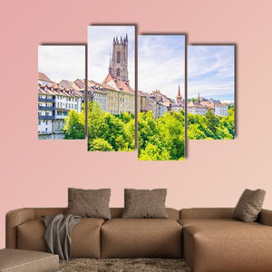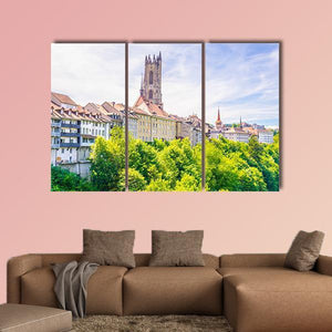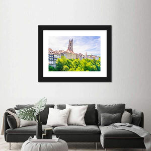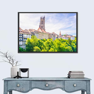 Saint Nicholas Cathedral at Fribourg is shown in a wide, eye-level cityscape that highlights the gothic church tower and dense green foliage in the foreground. The realistic scene, with greens, white, yellow and blue tones, feels peaceful and historic and works well in living rooms, studies, or entryways.