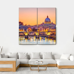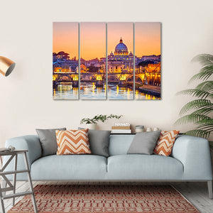 This canvas art captures the majestic St. Peter's Basilica illuminated in a serene twilight setting over the Tiber River. The warm orange and cool blue hues reflect beautifully off the water, creating a romantic atmosphere ideal for enhancing your living space.