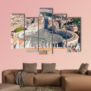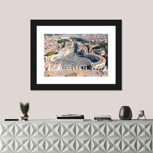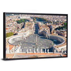 Saint Peter's Square in Vatican City is captured in a photorealistic cityscape that feels grand and sunlit. The aerial, symmetrical view emphasizes the colonnades, statues, central obelisk and basilica façade, a strong choice for living rooms or entryways in modern or classic homes.