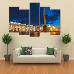 A wide, eye-level night view of Saint Petersburg that highlights an illuminated palace, a statue-topped column, and the open plaza under a dark, clouded sky. Deep blues with touches of gold and white create a grand, historical evening mood that works well with modern or classic room decor.
