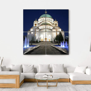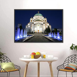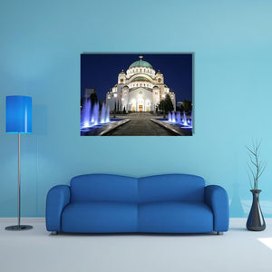 This canvas art features the stunning Saint Sava church under a serene nighttime sky. The illuminated facade and water fountains create a grand atmosphere, making it a captivating piece for any space.