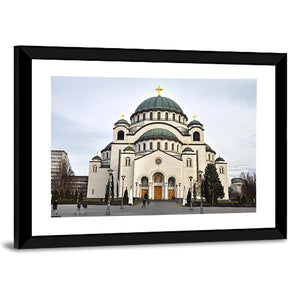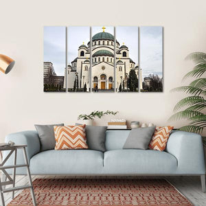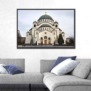 Bring the serenity of the Saint Sava Church into your home with this majestic canvas wall art. Featuring an ornate facade and a large central dome crowned by a golden cross, this piece captures the essence of architectural beauty with its harmonious blend of white, green, and gold tones.